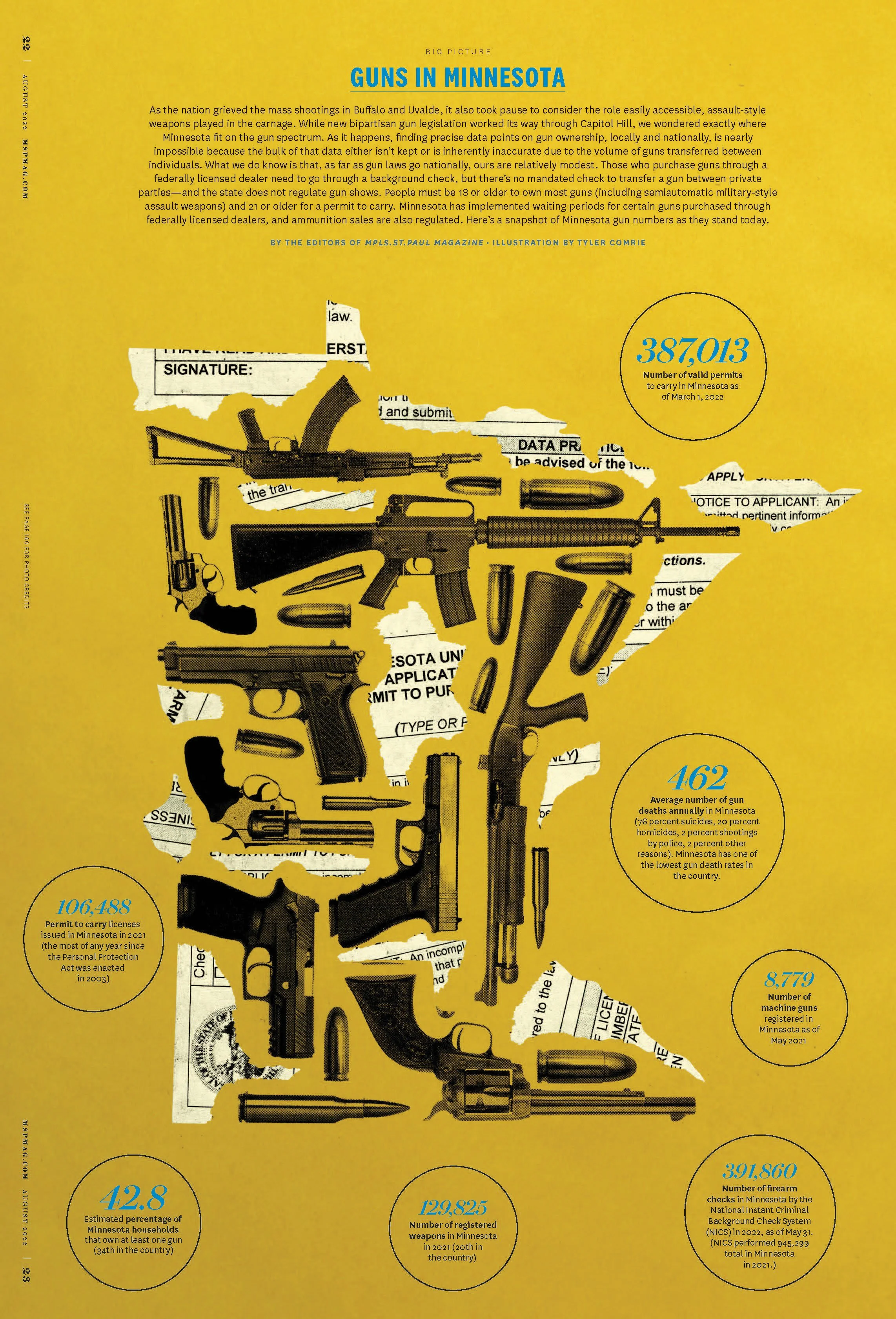 I took the lead on how this sensitive topic could be visualized. I made a quick collage from scraps of gun licenses and ammunition in the shape of our state. I reached out to illustrator Tyler Comrie of TycoStudio to execute the breif with his stunning eye for concept, color, composition, and style.