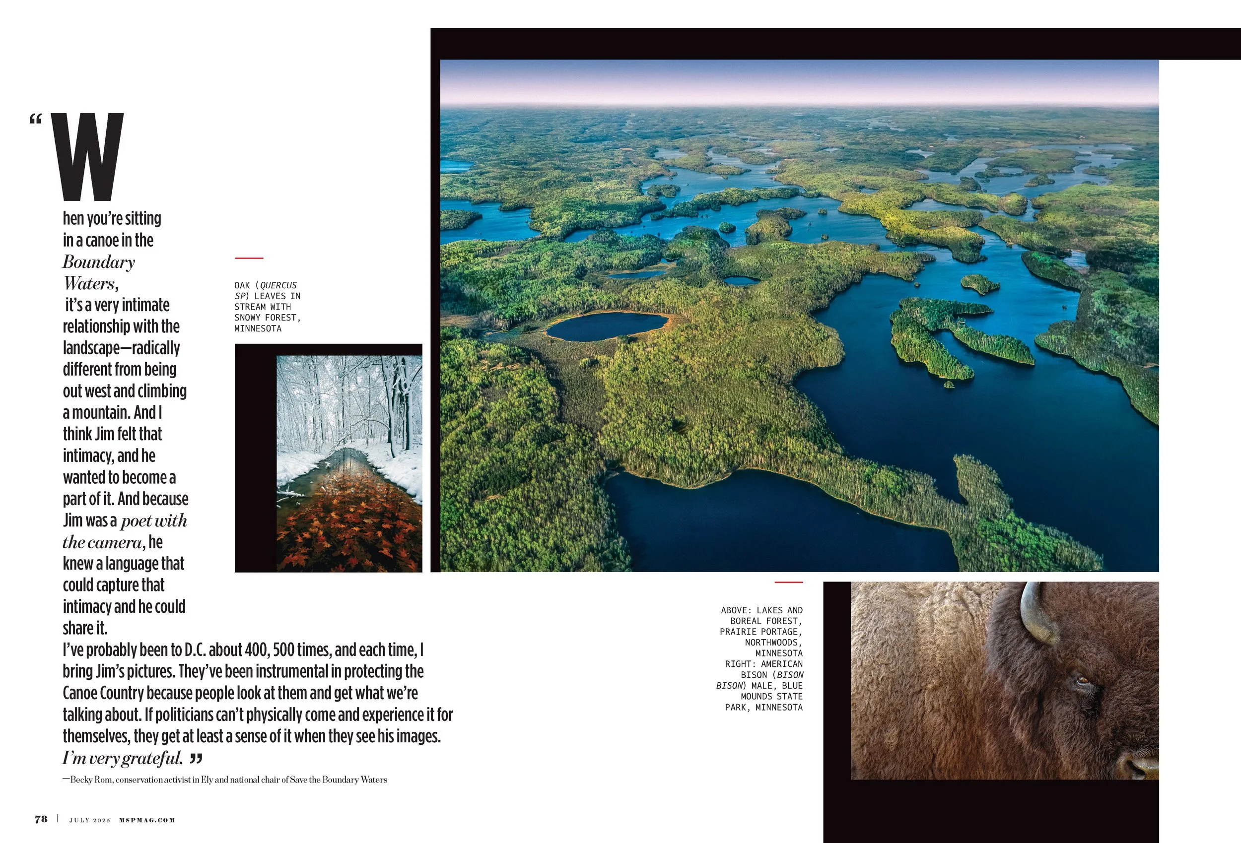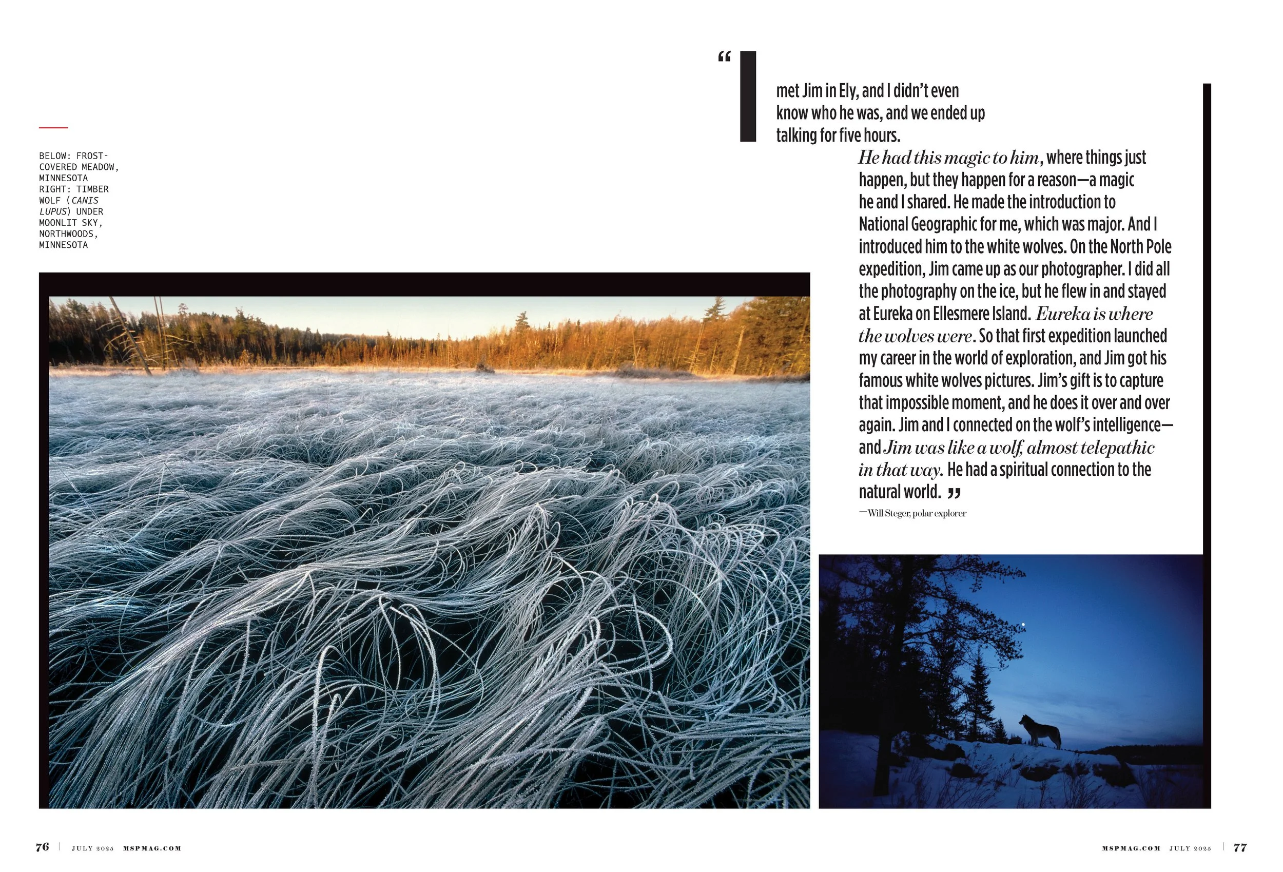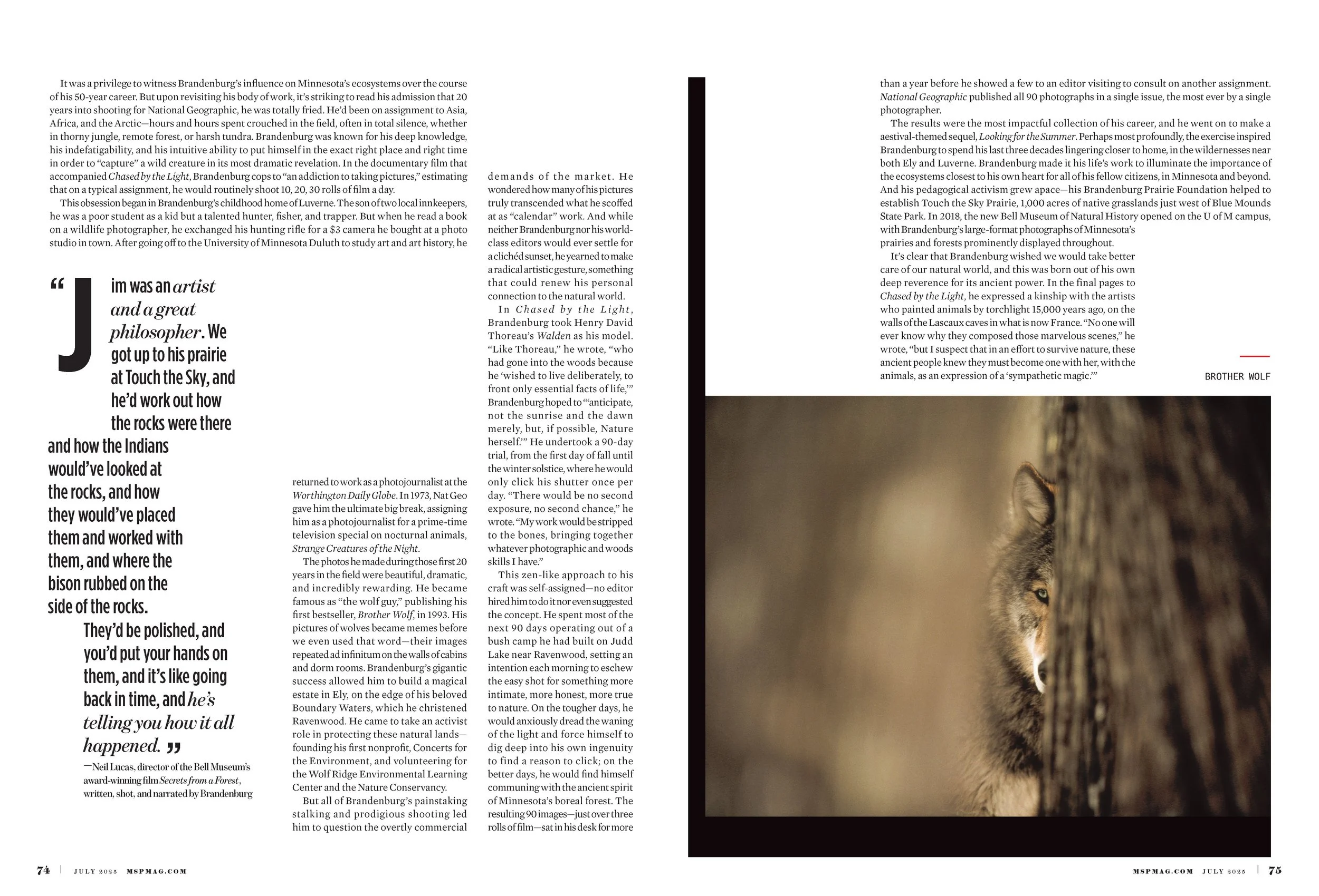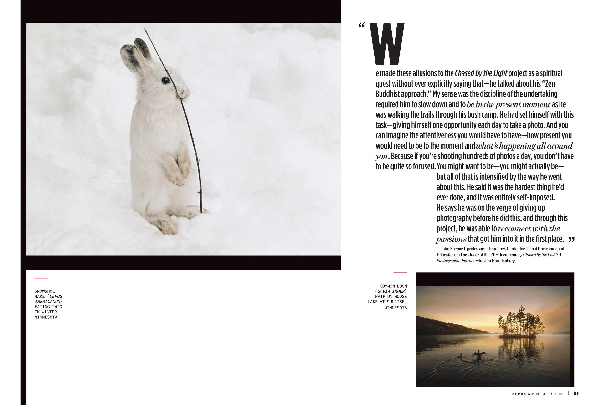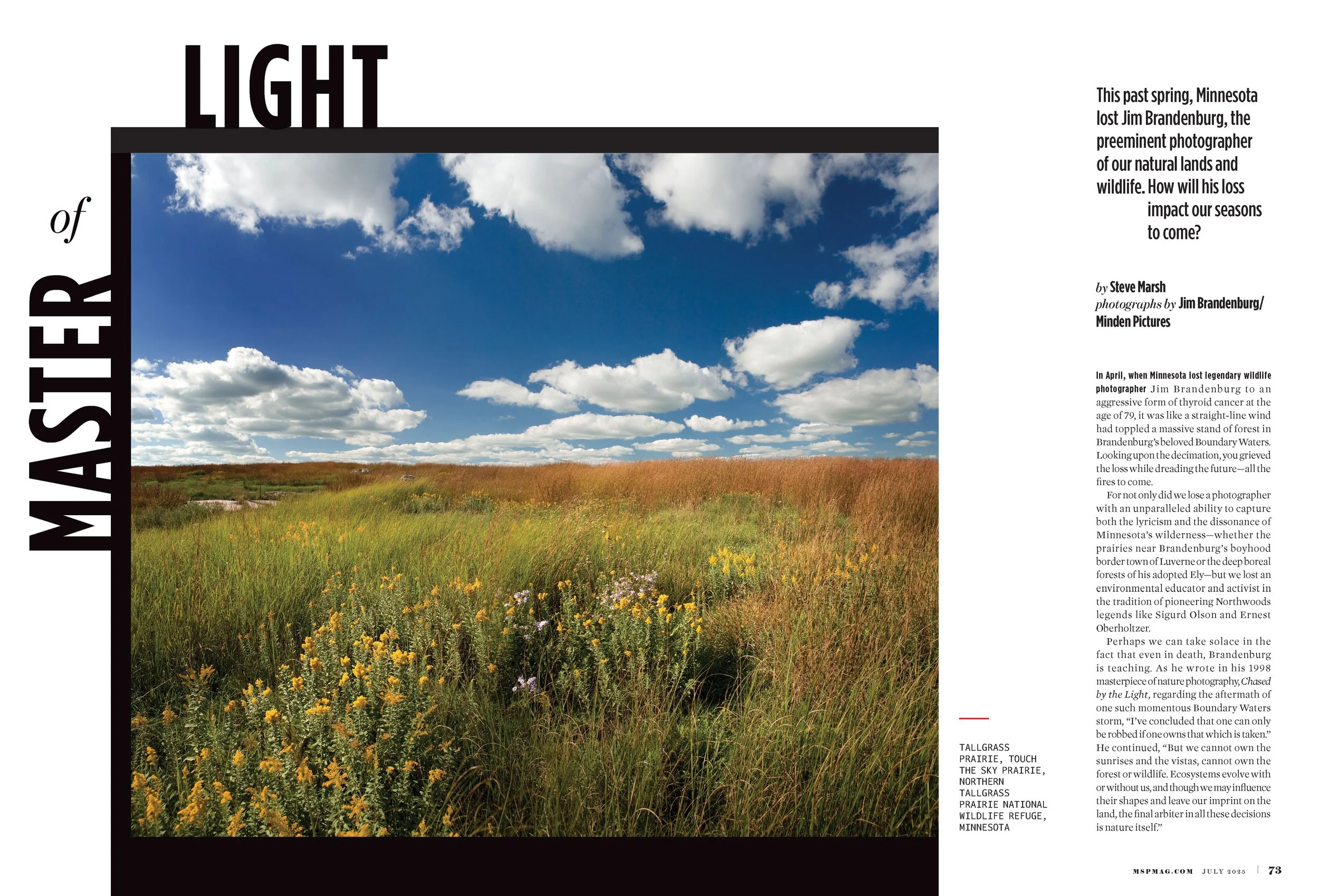 Layout and design for MplsStPaul Magazine feature on photographer Jim Brandenburg. Jim is a Minnesota-based, National Geographic Lifetime Achievement Award-winning artist. My intent was to make light feel as if it’s moving through the pages and to highlight his work in a gallery-like setting.