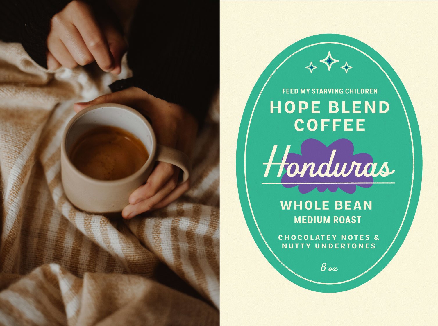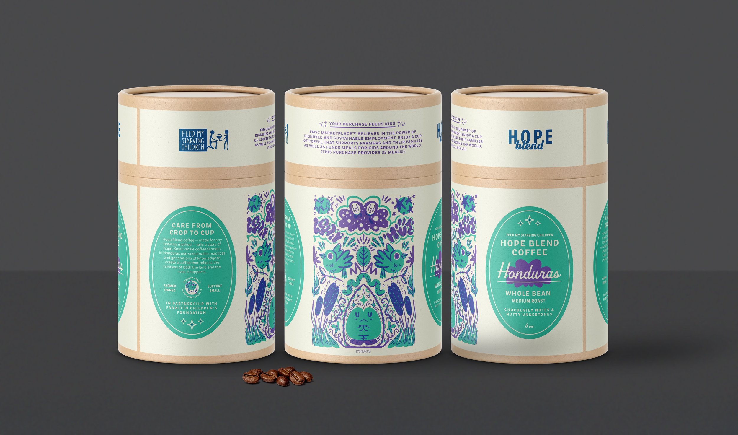We collaborated with nonprofit Feed My Starving Children to design a specialty coffee package for a conference of top donors at the end of 2025. This package housed beans from Honduras and I collaborated with a local Honduran artist to license his illustration and design the labels to center his art and tell the story of this nonprofit’s mission.